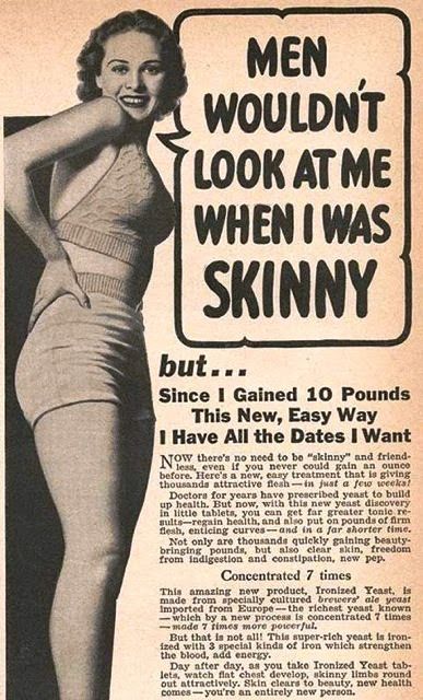 The weight loss industry has made billions, a lot of it from targeting women’s insecurities about their bodies. We’re supposed to be neither too thin nor too fat. How do you scare women into smoking? Tell them they’ll get fat if they don’t. What if you’re too scrawny, without the curves needed to attract men? Some yeast tablets could come in handy. But if you think cigarettes are the worst thing advertised to women for weight loss, how about some amphetamine: