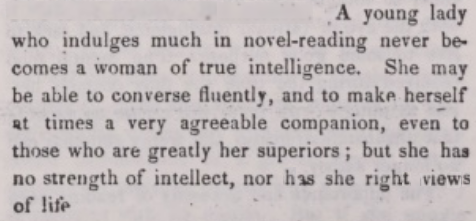 Men have always been concerned with what women read. There was serious literature and then women’s novels. Even today, the experience of a man giving his unsolicited opinion about what a woman reads is common. It is important to read so that you are seen as having a brain, however inferior. But also don’t fill that pretty head of yours with too many fantasies: